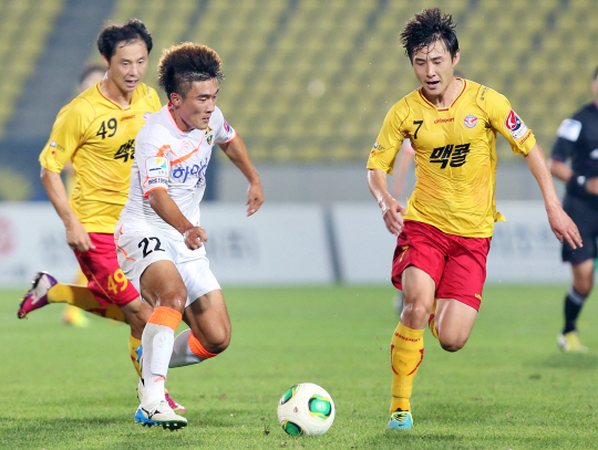 ◇성남 김한윤(왼쪽)과 김철호가 28일 탄천종합운동장에서 가진 강원과의 2013년 K-리그 25라운드에서 강원 최진호를 마크하고 있다. 사진제공=강원FC