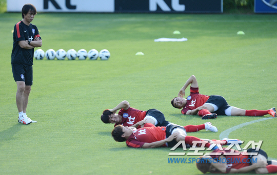 홍명보 감독이 이끄는 2014 브라질월드컵 축구대표팀이 2일 파주 NFC에 소집됐다. 홍명보 감독이 선수들의 스트레칭을 지켜보고 있다. 축구대표팀은 아이티(9월6일 오후 8시·인천축구전용경기장) 그리고 크로아티아(10일 오후 8시·전주월드컵경기장)와 평가전을 치른다. 이번 평가전에는 손흥민(21·레버쿠젠), 구자철(24·볼프스부르크), 김보경(24·카디프시티), 지동원(22·선덜랜드), 이청용(25·볼턴), 박주호(26·마인츠), 윤석영(23·퀸즈파크레인저스)이 유럽파로서는 처음으로 홍명보호에 승선해 경기를 치른다. 파주=정재근기자 cjg@sportschosun.com