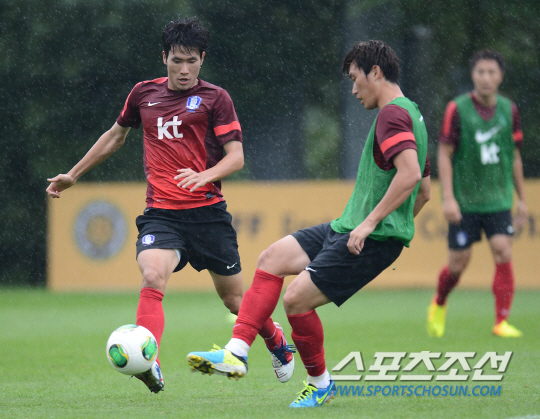 2013 동아시안컵 축구대회에 출전 중인 축구대표팀이 22일 파주 축구트레이닝센터에서 훈련을 했다. 많은 비가 내리는 가운데 선수들이 조끼를 나눠입고 미니게임을 하고 있다. 지난 20일 호주와의 첫 경기에서 0대0 무승부를 기록한 대표팀은 오는 24일 중국과 경기를 치른다. 파주=정재근기자 cjg@sportschosun.com