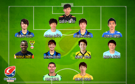 베스트11 투톱에는 케빈(전북)과 김동섭(성남)이 이름을 올렸다. 최고의 미드필더로는 MVP 마라냥을 포함해 황일수(대구) 심동운(전남) 이석현(인천)이 선정됐다. 최고의 수비수에는 김영삼(울산) 이윤표 최종환(이상 인천) 이지남(대구)가 뽑혔다. 최고의 수문장은 울산의 김승규가 차지했다.