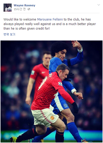 웨인 루니(맨체스터 유나이티)가 맨유에 입단한 마루앙 펠라이니에게 환영 메시지를 띄웠다.