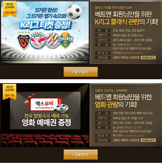 국민체육진흥공단(www.kspo.or.kr)이 발행하는 체육진흥투표권 수탁사업자인 스포츠토토의 공식 온라인 발매 사이트 베트맨(www.betman.co.kr)이 국내프로축구 K-리그 클래식 예매권을 제공하는 문화혜택 스포츠 16탄과 영화 포털 맥스무비에서 영화를 예매할 수 있는 예매권을 증정하는 문화혜택 영화1탄 이벤트를 진행한다.