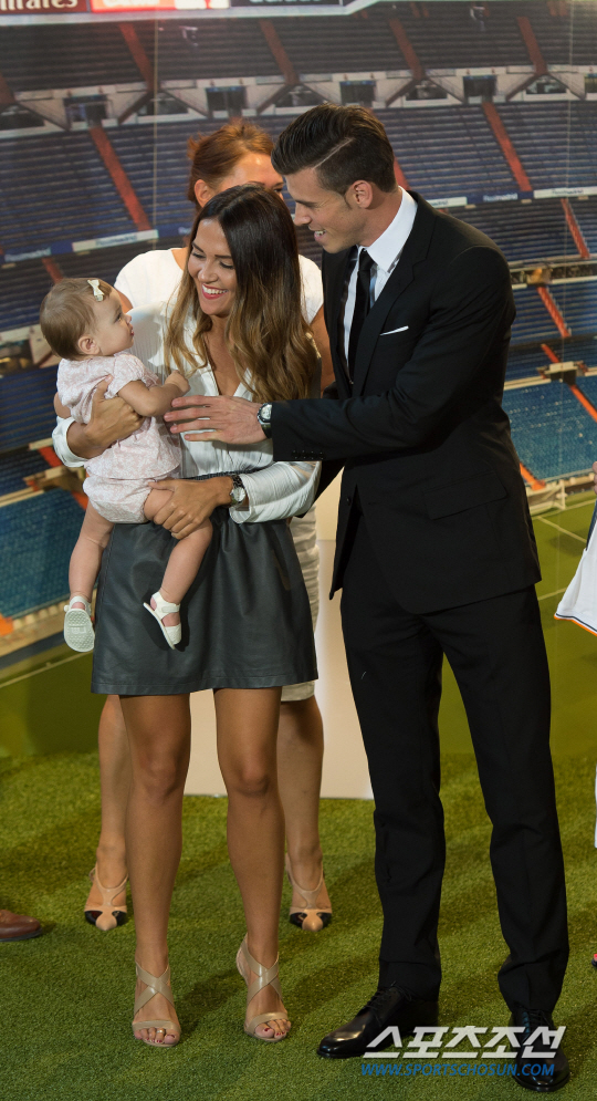 | 베일의 레알 마드리드 입단식에 함께 참석한 연인 엠마와 딸 알바 비올렛. | |
