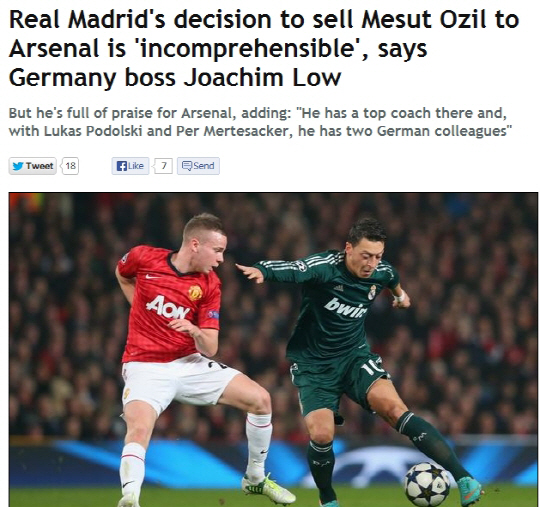 호아킴 뢰브 독일 대표팀 감독이 메주트 외칠을 판 레알 마드리드 선택에 아쉬운 반응을 보였다. 외칠은 여름이적시장이 닫히기 바로 1시간 전에 4200만파운드에 아스널 유니폼을 입었다. 오스트리아와의 2014년 브라질월드컵 유럽지역 예선을 앞둔 뢰브 감독은 5일(한국시각) 영국 일간지 데일리미러를 통해 "사미 케디라, 크리스티아누 호날두 같은 많은 레알 마드리드의 선수들이 외칠의 이적을 슬프게 생각하고 있다"며 "최고의 선수 중 하나를 판 레알 마드리드를 이해할 수 없다"고 했다.