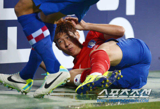 홍명보 감독이 이끄는 축구대표팀이 10일 전주월드컵경기장에서 FIFA랭킹 8위의 크로아티아와 격돌했다. 손흥민이 공격을 시도하다 넘어지며 광고판에 부딪히고 있다. 전주=정재근기자 cjg@sportschosun.com |