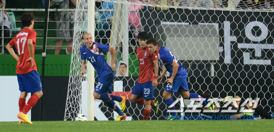 홍명보 감독이 이끄는 축구대표팀이 10일 전주월드컵경기장에서 FIFA랭킹 8위의 크로아티아와 격돌했다. 크로아티아 비다가 헤딩슛으로 골을 성공시킨 후 환호하고 있다. 전주=정재근기자 cjg@sportschosun.com |