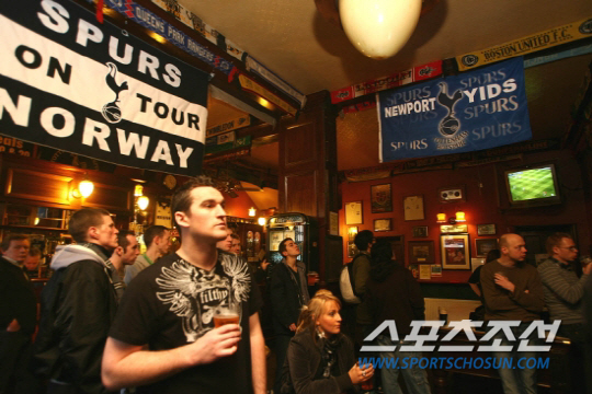2007,02,05 토트넘과 맨유의 경기 티켓을 구하지 못한 토트넘 팬들이 구장 근처의 펍에서 맥주를 마시며 TV를 통해 관전하고 있다.실내장식이 온통 토튼햄구단 기념품으로 가득 치장되어있다. 스포츠조선 DB |