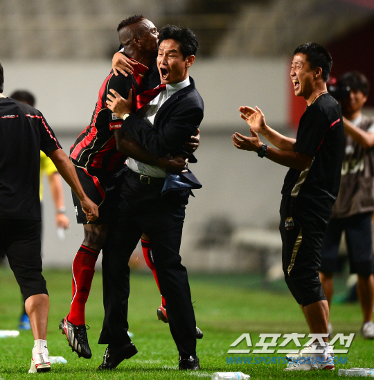 | 서울과 포항의 K리그 클래식 2013 28라운드 경기에서 후반 고명진의 쐐기골이 터지자 최용수 서울 감독이 기뻐하고 있다.상암=허상욱 기자 wook@sportschosun.com |
