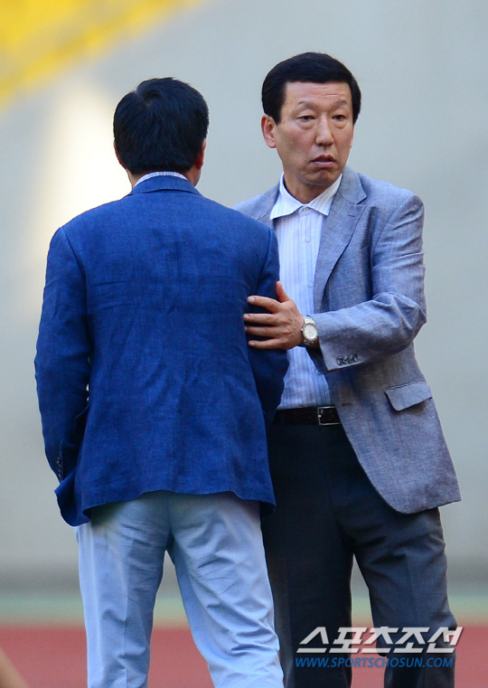 부산 아이파크와 전북 현대의 2013 FA컵 4강전이 15일 부산아시아드주경기장에서 열렸다. 3-1로 승리한 전북 최강희 감독이 부산 윤성효 감독을 위로하고 있다. 부산=정재근기자 cjg@sportschosun.com/2013.09.15/