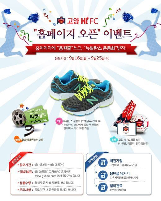 고양은 이번 홈페이지 오픈을 기념해 '페이스 북 친한 친구 소환시키기', 홈페이지에 고양 Hi FC 응원글 달기' 이벤트를 실시한다. 가장 많은 페이스 북 친구를 소환한 팬(1명)에게는 뉴발란스 운동화가 제공되며, '응원글 달기' 이벤트는 회원가입 인원에 한해 무작위로 추첨, 뉴발란스 운동화(1명), 고양 Hi FC 상품 SET(사인볼+머플러+연간회원권)세트(5명), 영화예매권(1인2매-10명)이 증정된다.