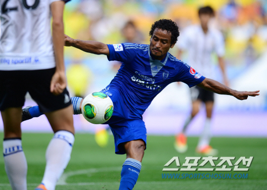 수원 삼성 블루윙즈와 인천 유나이티드의 2013 K리그 클래식 29라운드 경기가 22일 수원 월드컵경기장에서 열렸다. 수원 산토스가 발리킥으로 선제골을 성공시키고 있다. 수원=정재근기자 cjg@sportschosun.com