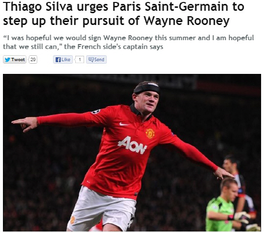 파리생제르맹의 주장 치아구 시우바의 말이다. 시우바는 22일(한국시각) 영국 일간지 데일리미러를 통해 웨인 루니 영입 희망을 포기하지 않을 것이라는 뜻을 전했다. 시우바는 "나는 올여름 루니를 영입할 수 있을 것이라는 희망을 가졌다. 지금도 마찬가지다"고 했다. PSG는 여름 내내 루니와 연결됐지만, 맨유의 강한 저항으로 뜻을 이루지 못했다. 마음을 다잡은 루니는 맨유의 에이스다운 맹활약을 펼치고 있다.