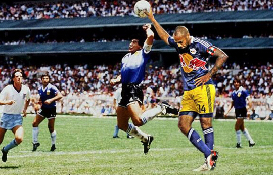 가장 인상깊은 패러디물은 디에고 마라도나의 '신의 손' 장면이다. 아르헨티나와 잉글랜드의 1986년 멕시코월드컵 8강전 도중 마라도나가 골키퍼와 공중볼을 다투면서 손으로 공을 건드리는 반칙으로 골을 터뜨렸지만 주심은 이를 득점으로 인정했다. 이 골은 아르헨티나와 잉글랜드 축구 팀 사이의 라이벌 관계를 상징적으로 잘 드러내는 사건 중의 하나이다.