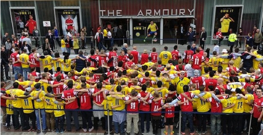 이들은 11번이 새겨진 외질의 홈과 원정 유니폼을 나눠 입고 구장 측면의 용품숍 앞에서 마치 시위를 벌이듯 어깨동무를 하고 '복덩이' 외질의 환영 행사를 벌였다.