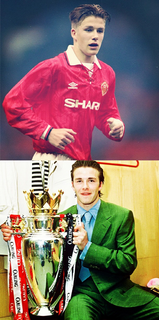 맨유는 이와 함께 4년 뒤인 1996년 컵대회 우승컵 옆에서 포즈를 취한 베컴의 사진도 함께 게재했다. 깎아지른 듯한 외모와 함께 초록색 수트가 눈길을 끈다. <스포츠조선닷컴>