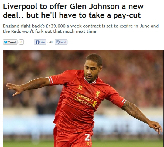 2009년 포츠머스에서 리버풀로 이적한 존슨은 내년 6월 계약기간이 만료된다. 브렌단 로저스 감독은 24일(한국시각) 영국 일간지 데일리미러를 통해 존슨을 붙잡고 싶다는 뜻을 밝혔다. 로저스 감독은 "재계약 협상을 할 시간이 왔다"고 했다. 한가지 조건이 있다. 데일리미러는 리버풀이 존슨이 현재 받고있는 13만9000파운드의 주급을 줄여 재계약을 제안할 것이라고 보도했다.