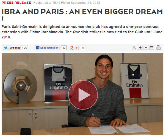 즐라탄 이브라히모비치(31)가 소속팀 파리 생르제맹(PSG)과 1년 계약 연장을 한다.