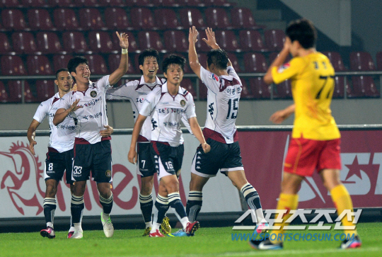 성남과 대전의 2013 K리그 클래식 21라운드 경기가 4일 성남탄천종합운동장에서 열렸다. 대전 윤원일(33번)이 1-2로 뒤지고 있던 후반 동점골을 터뜨리며 기쁨을 나누고 있다. 성남=허상욱 기자 wook@sportschosun.com/2013.08.04/