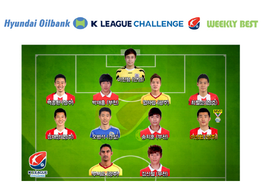 K-리그 챌린지 25라운드에선 3경기 연속 골을 올린 이상협(상주)이 MVP로 뽑혔다. 김신철(부천)과 루시오(광주)가 위클리 베스트 11 공격수로 이름을 올렸다. 미드필더에는 이상협을 비롯해 송치훈(부천) 오범석(경찰) 김재성(상주)이 올랐다. 수비수로는 최철순 백종환(이상 상주) 임하람(광주) 박재홍(부천)이 뽑혔고 이진형(안양)은 최고의 골키퍼로 선정됐다. 김성원 기자 newsme@sportschosun.com