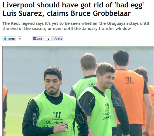 그로블라는 26일(한국시각) 영국 라디오 토크스포츠를 통해 "만약 경기력으로만 평가를 한다면 수아레스가 잔류하는 것은 리버풀에 도움이 된다. 하지만 그가 시즌 전에 리버풀에 보여준 태도를 생각한다면 팀에 남고 싶지 않은 선수들은 제거하는 편이 낫다"고 햇다. 그는 이어 "수아레스가 팀을 떠나고 싶다고 했을때 나는 '그를 제거해야 해'라고 생각했다. 왜냐하면 그는 팀에 있는 썩은 달걀이라고 생각했기 때문이다. 로저스 감독은 결국 그를 잔류시켰지만, 수아레스가 얼마나 팀에 헌신적일지는 모르겠다. 가능하다면 1월에 이적시키는 것도 고려해야 한다"고 강한 어조로 말했다.