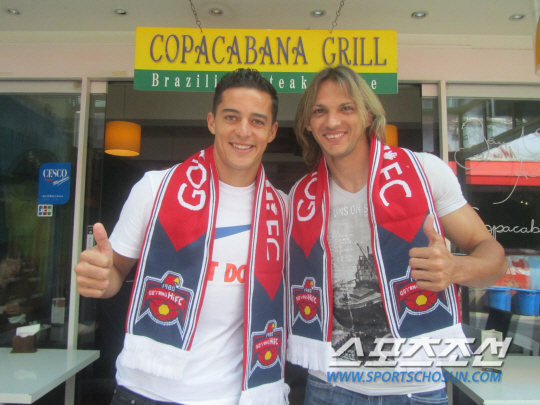 ◇고양 Hi의 기적을 이끄는 브라질 듀오 공격수, '알브라더스' 알렉스(왼쪽)와 알미르가 지난 9일 이태원 브라질 레스토랑 앞에서 엄지를 치켜든 채 포즈를 취했다. 전영지 기자