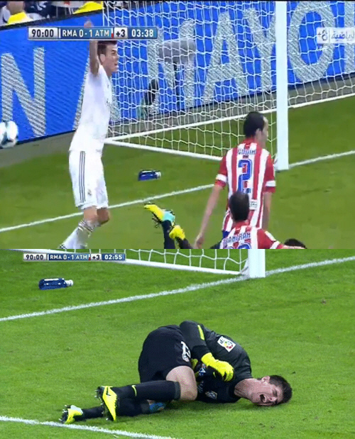 베일은 시간이 흘러가자 경기 속개를 위해 공을 빼앗으려고 덤벼들었고, 이에 쿠르투아는 파울을 유도해 시간을 좀 더 끌기 위해 연기(?)를 한 듯 보인다.