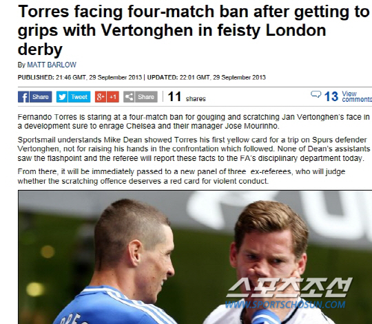 문제는 첫번째 옐로카드 장면에서 토레스가 베르통헨의 얼굴을 손으로 움켜쥐면서 밀치는 장면이 카메라에 잡혔다는 점이다. 현장에서 이 장면에 대한 판정은 이뤄지지 않았지만, 주심은 영국축구협회 징계위원회에 제출하는 경기리포트에 이부분을 기록한 것으로 알려졌다. 이 장면이 레드카드를 주기에 충분한 폭력적인 장면으로 인정될 경우 추가징계 가능성도 점쳐지고 있다.