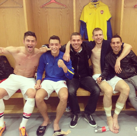 메수트 외질을 비롯한 아스널 선수들이 라커룸에서 승리를 자축하는 포즈를 취했다.