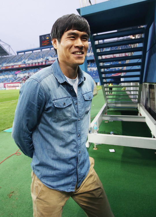 | ◇김영후가 지난달 28일 대전월드컵경기장에서 열린 대전과의 2013년 현대오일뱅크 K-리그 클래식 30라운드에서 강원이 3대1로 승리하자 환한 미소를 짓고 있다. 사진제공=강원FC |