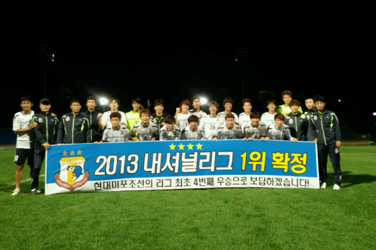 울산현대미포조선은 2일 천안축구센터에서 열린 천안시청과의 2013년 신한은행 내셔널리그 25라운드에서 4대0 완승을 거뒀다. 승점 48점(14승6무5패)을 확보한 울산현대미포조선은 남은 경기에 상관없이 정규리그 1위를 확정지었다. 울산현대미포조선은 내셔널리그가 단일리그로 전환한 2011년 이래 2번째 정규리그 우승을 차지했다. 챔피언결정전에 직행한 울산현대미포조선은 통산 4번째 통합우승에 도전하게 됐다. 울산현대미포조선은 초반부터 창원시청을 강하게 몰아붙였다. 전반 1분만에 김오성이 선제 결승골을 터뜨렸다. 기세가 오른 울산현대미포조선은 전반 33분과 후반 8분 진대성, 후반 28분 이선후가 연속골을 성공시키며 정규리그 우승을 자축했다.