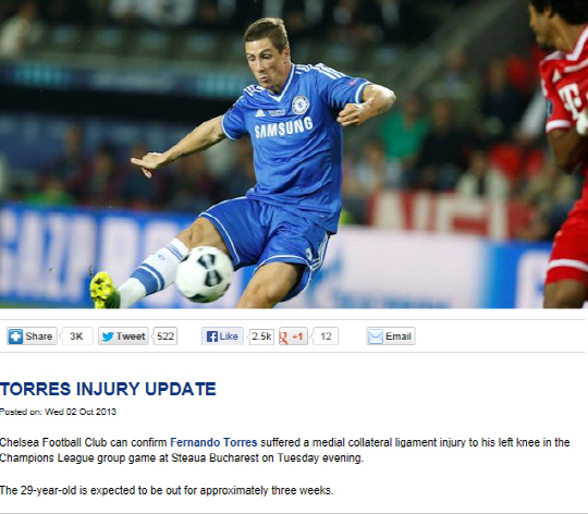 그러나 영국의 데일리메일은 조기 복귀 가능성을 열어뒀다. '토레스의 부상이 빨리 회복된다면 샬케와의 UCL 경기나 맨시티와의 홈경기에 출전할 수 있을 것'이라며 '사무엘 에토오와 뎀바 바가 토레스의 공백을 메울 것'이라고 전망했다.