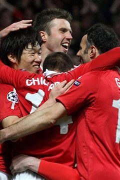 ◇박지성(왼쪽)이 맨유 소속이던 지난 2011년 4월 12일(한국시각) 영국 맨체스터의 올드 트래포드에서 펼쳐진 첼시와의 2010~2011시즌 유럽챔피언스리그 8강 2차전에서 득점한 뒤 동료들로부터 축하를 받고 있다. 사진출처=맨유 구단 홈페이지