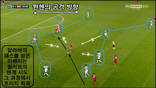 공격이 잘 풀린 것도 아니다. 분데스리가에서 밀집 수비로써 온갖 견제를 받아온 뮌헨은 맞불을 놓으려 했던 맨시티에 끊임없이 맹공을 퍼부었다. 볼을 오래 소유한 이들이 꾸준히 페널티박스 지점까지 접근하면서 맨시티는 기본적으로 공격할 기회가 많지 않았다. 조하트의 골킥은 주로 제코를 향했는데, 뮌헨은 단테가 전진하면서 헤딩 경합을 하고 람이 슬쩍 빠져 그 뒷공간을 커버하는 식으로 대응해냈다. 공중볼을 따내지 못했을 때에는 수비 진영부터 차근차근 썰어나가는 방법도 있었으나, 뮌헨이 리베리-뮐러-로벤 쓰리톱을 활용한 전방 압박에도 적극적이었기에 이마저도 어려웠다. 그러다 보니 전진 패스의 배급 자체가 쉽지 않았다.