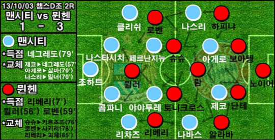 80분에 다다를 무렵, 수심 가득한 얼굴 아래 등장한 '4 vs 19'라는 슈팅 개수. 맨체스터 시티(이하 맨시티)의 경기력이 그대로 배어 있었던 이 수치가 더없이 서글프게 다가왔다. 네그레도가 환상적인 턴에 이은 왼발 슈팅으로 한 골을 따라갔으며 실바가 크로스바를 때려 뮌헨을 위협했으나, 거기까지였다. 맨시티는 4일 새벽(한국 시각) 이티하드 스타디움에서 열린 바이에른 뮌헨(이하 뮌헨)과의 13-14 UEFA 챔피언스리그 D조 2차전에서 1-3으로 완패했다. 이들은 왜 그리도 맥없이 무너진 걸까.