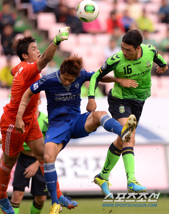 29일 전주월드컵경기장에서 K리그 클래식 전북현대와 수원삼성의 경기가 열렸다. 전북 김신영(오른쪽)이 수원 정성룡 골키퍼를 앞에 두고 헤딩슛을 시도하고 있다. 전주=송정헌 기자 songs@sportschosun.com
