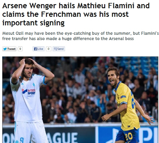 마티유 플라미니다. 올시즌 자유계약으로 친정팀 아스널로 복귀한 플라미니는 소금같은 활약으로 아스널의 상승세를 이끌고 있다. 플라미니는 눈에 띄지는 않지만 팀밸런스를 유지하는데 결정적인 역할을 하고 있다. 아르센 벵거 감독도 플라미니에 대한 칭찬을 빼놓지 않았다. 벵거 감독은 "플라미니는 공격과 수비 밸런스를 유지시켜주고 있다. 그는 팀에서 가장 눈에 띄지 않는 역할을 하는 선수다"고 극찬했다.