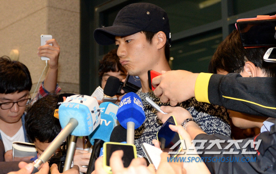 기성용 공식사과. 7일 오전 인천공항을 통해 기성용-한혜진 부부가 입국 했다. 최근 축구국가대표로 다시 발탁된 기성용은 많은 취재진의 관심이 부담스러운듯 한혜진과 별도로 입국장을 나섰다. 무거운 표정으로 입국장에서 기자들의 질문에 답하고 있는 기성용. 인천=송정헌 기자 songs@sportschosun.com/2013.10.7