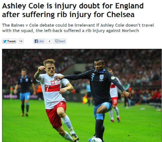 로이 호지슨 감독이 콜의 부상 소식에 민감할 수 밖에 없는 이유가 있다. 폴란드, 몬테네그로와 2014년 브라질월드컵 본선행을 두고 중요한 2연전이 남아있기 때문이다. 호지슨 감독은 지난달 몰도바, 우크라이나와의 경기에서는 주축선수들을 모두 부상으로 잃은채 경기를 할 수 밖에 없었다. 현재까지는 콜만 부상이지만, 리그 경기도중 어떤 부상이 나올지 몰라 조마조마한 심정이다.