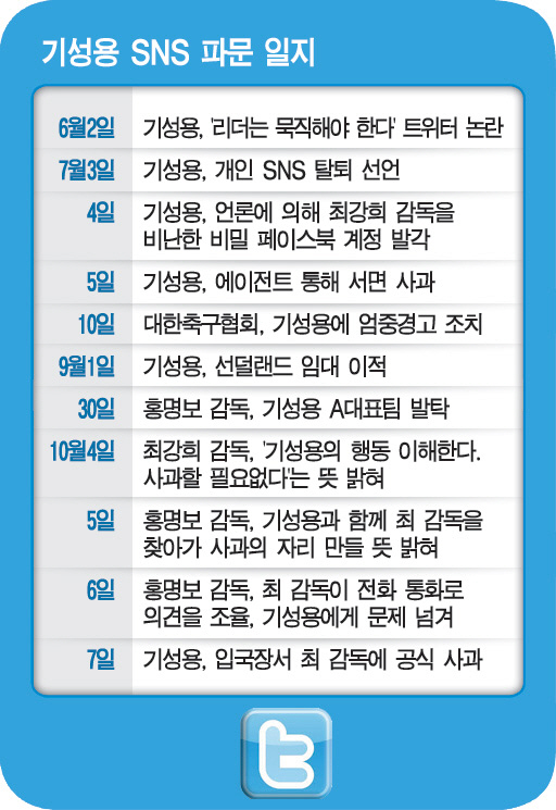기성용의 SNS 논란은 지난 6월 시작됐다. 기성용이 트위터를 통해 '리더는 묵직해야 한다'는 글을 게재하면서 불거졌다. 당시 최 감독을 겨냥했다는 추측이 불거졌다. 그러나 기성용이 비밀 페이스북 계정에 올린 '최강희 감독 비방 글'이 7월 4일 공개되면서 논란이 일파만파 커졌다. 이후 기성용은 하루 뒤인 5일 에이전트를 통해 서면으로 사과를 했다. 최강희 전북 감독도 기성용의 사과를 수용할 의사를 밝혔다. 10일 협회가 기성용에게 '엄중 경고' 조치를 내리며 사건이 일단락되는 듯 했다. 그러나 전례가 없던 파문이었던 만큼 여론이 엇갈렸다. 기성용의 서면 사과에 '진정성'을 의심했다.