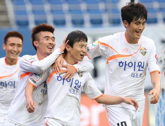 28일 오후 대전월드컵경기장에서 펼쳐진 현대오일뱅크 K리그 클래식 2013 강원FC와 대전 시티즌의 30라운드 경기에서, 강원FC 전재호(가운데)가 골 세레머니를 펼치고 있다. 전재호는 이날 두 골을 성공시켰다. 강원이 3-1로 승리했다. 2013.09.28.(사진=강원FC 제공)