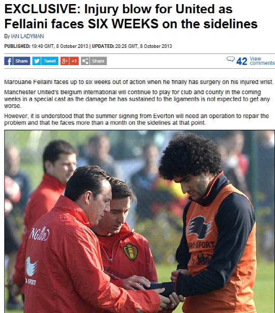 펠라이니는 수술 전까지는 경기를 소화할 것으로 보인다. 펠라이니는 현재 크로아티아-웨일스와의 2014년 브라질월드컵 유럽지역 예선전에 참가하기 위해 벨기에 대표팀에 합류한 상태다. 이후 맨유로 복귀, 부상전까지 보호장치를 하고 경기를 뛸 예정이다.