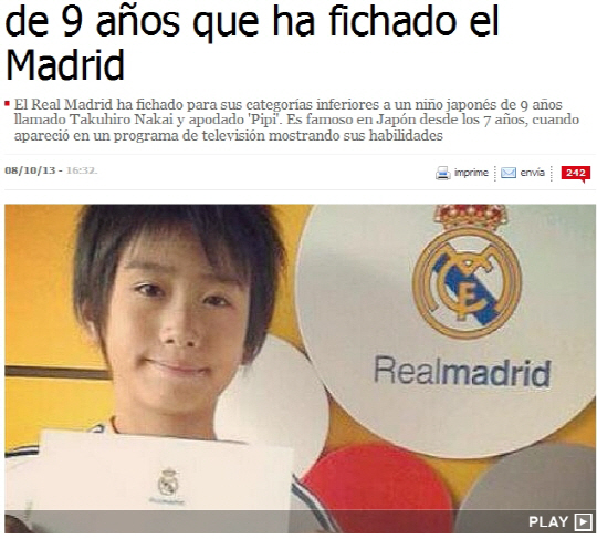 아스, 마르카 등 스페인 스포츠전문지는 8일(현지시간) 레알 마드리드가 일본 시가현 출신의 9세 소년인 다쿠히로 나카이와 계약했다고 보도했다. '피피'라는 별명을 지닌 다쿠히로는 일곱살 때부터 TV프로그램을 통해 빼어난 축구 실력을 선보여 이미 일본 내에선 유명한 축구 유망주였다. 경기 영상을 보면 다쿠히로는 화려한 발재간과 스피드를 앞세워 또래 몇 명을 순식간에 따돌리고 슛을 하며 눈길을 끈다. 다쿠히로는 앞으로 레알 마드리드 유스 시스템인 '칸테라'에서 집중 훈련을 받는다.