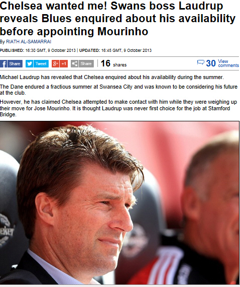 라우드럽 감독은 결국 스완지시티 잔류를 결정했고, 이제서야 '러브콜의 진실'을 밝혀지기 시작했다. 라우드럽 감독은 "어떤 이유에서는 나는 이미 스완지시티와 떠나지 않기로 약속한 상태였다"고 덧붙였다. 이 언론에 따르면 라우드럽 감독이 첼시의 러브콜을 받은 것은 조세 무리뉴 감독과 협상 중이던 시기다. 즉, 무리뉴 감독과의 협상이 불발될 경우에 대비한 플랜 B가 라우드럽 감독이었던 셈이다.