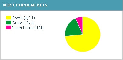 유력 베팅사이트 23개의 베팅 결과를 집계한 '오드체커'에 따르면 12일 오후 5시 현재 브라질 승리에 걸린 평균 배당률은 4/11로 한국의 9/1보다 월등하게 낮다.