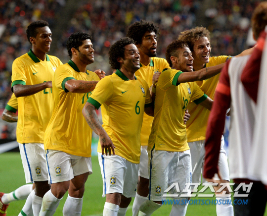 홍명보 감독이 이끄는 A대표팀이 12일 오후 서울 상암동 서울월드컵경기장에서 '영원한 우승후보' 브라질과 친선경기를 펼쳤다. 네이마르가 전반 43분 프리킥 선취골을 성공시키고 동료들과 함께 환호하고 있다. 상암=송정헌 기자 songs@sportschosun.com/2013.10.12