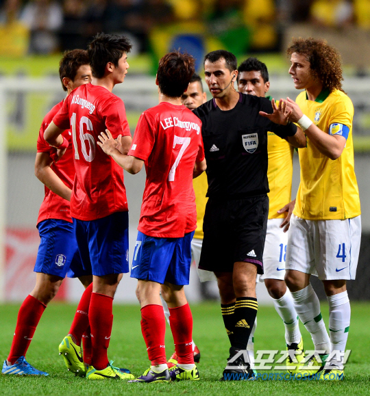 홍명보 감독이 이끄는 A대표팀이 12일 오후 서울 상암동 서울월드컵경기장에서 '영원한 우승후보' 브라질과 친선경기를 펼쳤다. 기성용이 브라질 선수들과 경기 도중 신경전을 펼치고 있다. 상암=송정헌 기자 songs@sportschosun.com |
