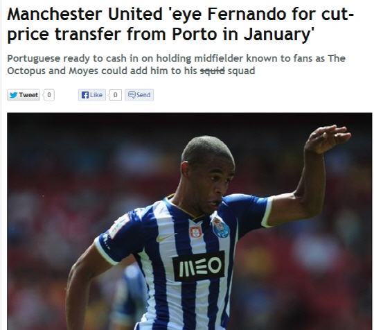 13일(한국시각) 영국 일간지 데일리미러는 맨유가 포르투의 수비형 미드필더 페르난도 영입을 시도했다고 보도했다. 페르난도는 물샐틈없는 수비력으로 '문어'라는 별명을 받고 있다. 그의 계약기간은 만료를 앞두고 있다. 포르투갈 신문 아볼라는 포르투가 유럽챔피언스리그 조별리그에서 탈락할 경우 페르난도를 1월이적시장에서 팔 계획을 세웠다고 했다. 이적료를 벌어들이기 위해서다. 페르난도는 맨유 뿐만 아니라 유벤투스와 인터밀란의 관심을 받고 있는 것으로 알려졌다.