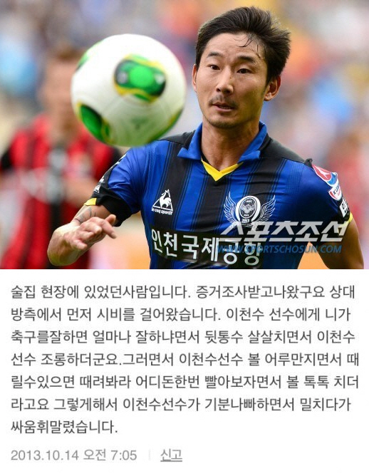 이 네티즌은 "(신고한 측이) 이천수에게 먼저 '네가 축구를 잘하면 얼마나 잘하냐'며 뒤통수를 치고 조롱했다"면서 "이천수가 결국 기분이 나빠 상대를 밀치면서 싸움에 휘말렸다"고 주장했다.
