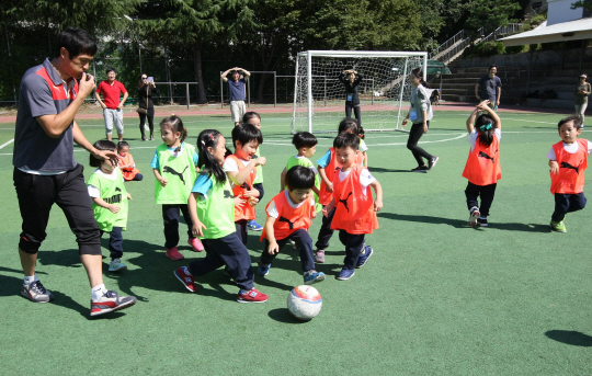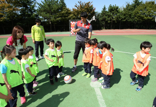부산은 13일 오전 반여중학교에서 3~6세 아이들을 위한 축구 클리닉을 열었다. 이번 행사는 부산 해운대 소재의 한 유아교육기관의 초청으로 이뤄졌다.