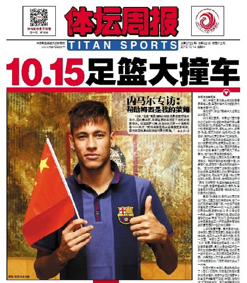 중국 유력 스포츠지 '티탄저우보'는 14일자 1면에 네이마르와의 단독 인터뷰를 싣고 특급 스타의 첫 중국 방문을 반겼다.